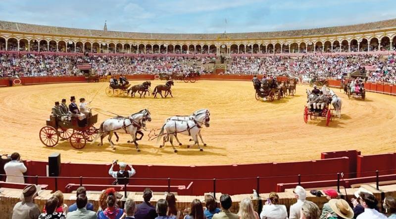 I piani per la Exhibición de Enganches nella Plaza de Toros, prevista per il giorno successivo, purtroppo sono stati cambiati a causa delle previsioni meteo avverse, e questo meraviglioso spettacolo è stato posticipato al mercoledì successivo. Non ho potuto restare a Siviglia per giudicare questa incredibile Esibizione, ma mi è stato riferito che circa 75 attacchi hanno sfilato nelle strade fuori dall’arena e successivamente circa 15 alla volta si sono presentati in movimento all’interno dell’arena stessa.