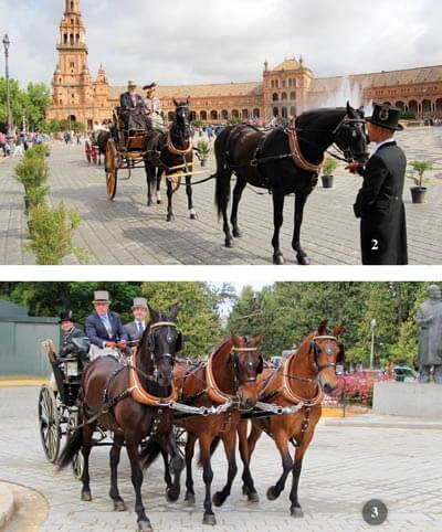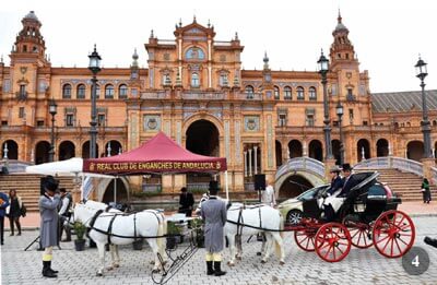 Il parcheggio dei van per cavalli è situato appena fuori dal centro città e gli attacchi devono essere preparati e percorrere circa 20 minuti di traffico urbano per raggiungere la splendida Plaza de España, dove la fase di Presentazione della competizione ha inizio puntualmente alle 9:30.