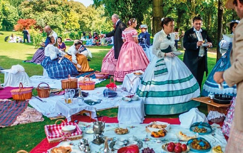Il tradizionale picnic sull’erba ha rappresentato uno dei momenti clou della giornata, con porcellane raffinate, bicchieri di cristallo e tovaglie ricamate che hanno ricreato un’immagine di eleganza e lusso. Sotto i grandi alberi, visitatori e anche ballerini, cocchieri, espositori hanno gustato dolci fatti in casa e frutta fresca, sentendosi protagonisti di scene da romanzo.