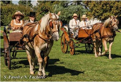 L’evento ha visto la partecipazione di carrozze provenienti dal Veneto, dalla Lombardia, dall’Emilia Romagna. In particolare Charlotte Engholm con un carretto agricolo dei primi del 900, trainato da un delizioso pony con finimento da lavoro originale, Antonio Mottin e Daniele Maiocchi in gara con un break in legno naturale di inizi ‘900 attaccato a una splendida cavalla TPR. Claudio Ongaro ha sfilato con un Phaeton leggero attaccato a un maestoso Frisone, seguito da Eliana Bolzoni, al suo esordio, con Duc De Dame del primo decennio del novecento, di costruttore cremonese. Ancora una signora alla guida ed è Silvana Fasoli, con la sua graziosa Pistoiese del secolo scorso e un elegante accompagnatore a fianco. Nicolas Facheris, giovane esordiente, presenta una Dottorina attaccata a un singolo Haflinger.