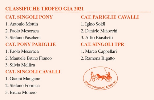 Le Premiazioni a fine gara sono state, come sempre, una festa, e, nella Finale sono stati premiati i vincitori della prima parte del Trofeo GIA 2021. Vanno, quindi ringraziati: i Centri ospitanti che non hanno lesinato omaggi a tutti i partecipanti e Il Cassettone, sponsor ufficiale di questo Trofeo, marchio noto ed apprezzato da tutti gli appassionati di Attacchi A concorrenti, circoli ippici, volontari gli applausi dei presenti e i ringraziamenti del GIA.