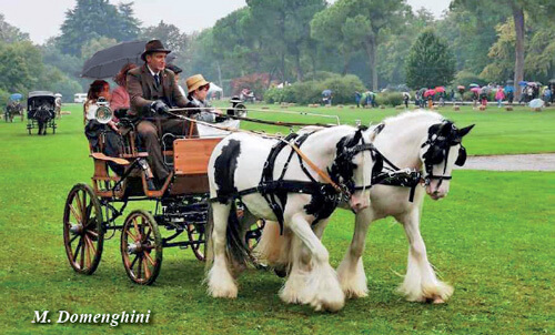 Le damigelle, i gentiluomini, intere famigliole intente a cambiarsi d’abito: cappelli e cappellini spuntavano dai van, nastri, cravatte e ombrellini in pizzo, guanti e cesti per il pic nic, papillon per i più piccoli. Parte la musica è l’ora di fare l’ingresso nel magico “Viaggio nel tempo”… piove e, come un tempo, si alzano le capote, si aprono gli ombrelli e i guidatori, per niente intimoriti, sistemano i propri cilindri e i grembiali pesanti a protezione delle gambe. Il Giudice del Concorso di Eleganza è posizionato al centro di un ampio spazio, attorno a lui si muovono tutte le carrozze ed è meglio non fermarsi, i cavalli devono mantenersi in movimento. Uno alla volta, davanti a Massimo Nicolotti, Giudice Internazionale AIAT, si presentano gli attacchi che vengono valutati con attenzione. Saluto di benvenuto e di commiato fra guidatore e Giudice, la segretaria Adriana è attenta a riportare i giudizi relativi all’armonia dell’attacco, allo stato della carrozza, al cavallo, ai finimenti e all’abbigliamento dei passeggeri.