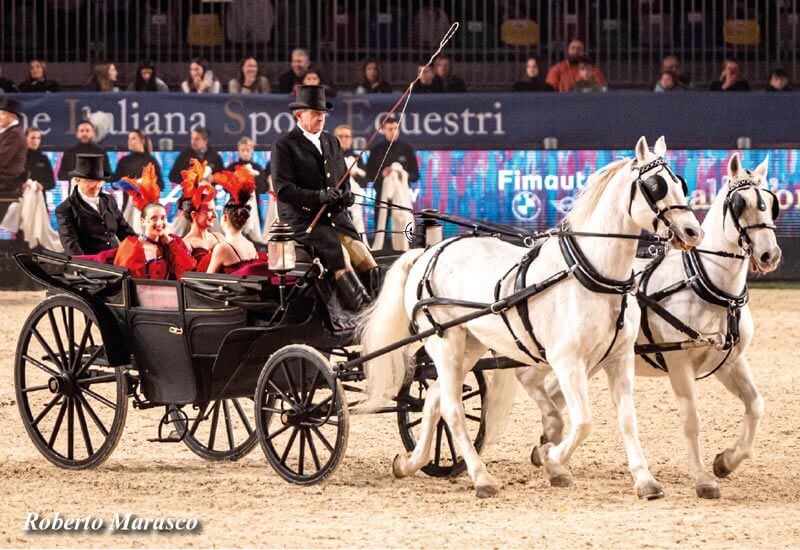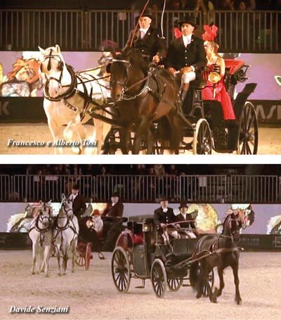 Ancora una carrozza di servizio a seguire, è una lucente Milord con alle stanghe due cavalli Spagnoli e alle redini l’esperto Francesco Tosi; due fantastiche ballerine a salutare il pubblico, che, al momento opportuno, il groom avrebbe fatto scendere per il numero di danza successivo. Attira l’attenzione il bel Brougham firmato Cesare Sala, famoso carrozziere milanese: una vettura chiusa risalente a metà 800 usata prevalentemente come trasporto pubblico in città condotta dal perfetto cocchiere Davide Senziani e attaccata a un singolo Frisone, che avanza maestoso ed elegante nell’arena.