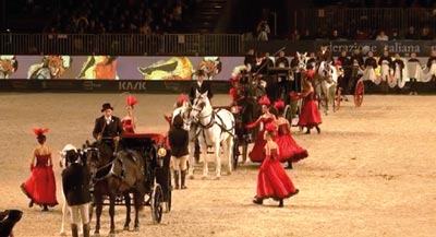 Fanali accesi, livree eleganti, immancabili cilindri, lussuosi finimenti e servitori di carrozza pronti a garantire la sicurezza e a mettersi a disposizione delle ballerina sorridenti in campo per la successiva esibizione.