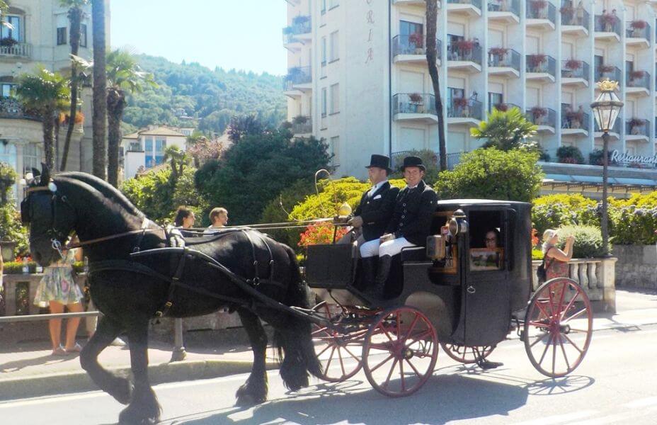 Carrozze e cavalli a Stresa Liberty domenica 9 Luglio, lungo lo spazio antistante il meraviglioso Hotel Palace per un Concorso di Eleganza, nel weekend dedicato all rievocazioni storiche della Belle Epoque, nella romantica cittadina di Stresa.