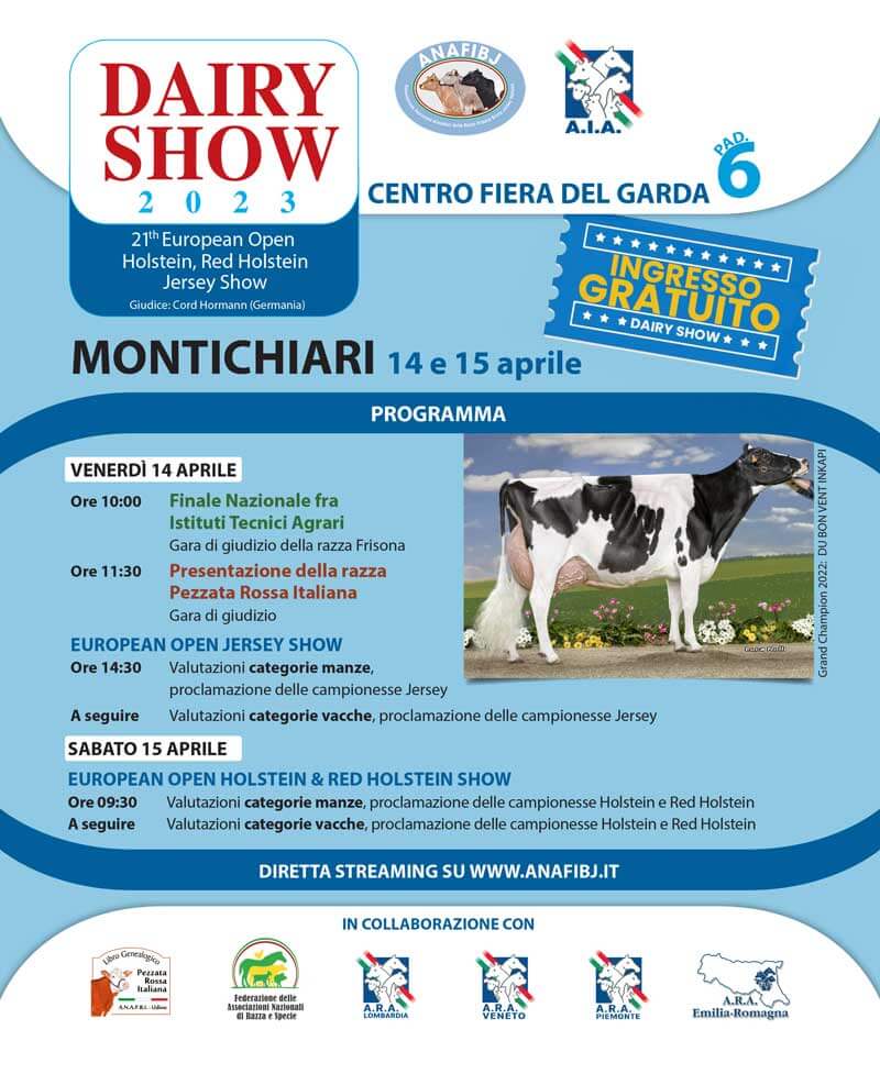 Il Centro Fiera del Garda di Montichiari, in provincia di Brescia, venerdì 14 e sabato 15 aprile 2023 ospiterà una “due giorni” da non perdere per gli allevatori ed i tecnici del settore bovino da latte, con un’edizione del “Dairy Show” organizzata da Anafibj (Associazione Nazionale Allevatori della razza Frisona, Bruna e Jersey Italiana), dall’Associazione Italiana Allevatori-A.I.A., in collaborazione con la FedANA (Federazione Nazionale delle Associazioni di Razza e Specie), l’Anapri (Associazione Nazionale Allevatori razza Pezzata Rossa Italiana) e le Associazioni Regionali Allevatori (Ara) di Lombardia, Piemonte, Veneto ed Emilia-Romagna.