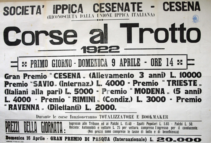 In quella data del 1922, alcuni “amatori dell’ippica” cesenati che avevano istituito la “Sezione Ippica” successivamente diventata “Società Ippica Cesenate”, inaugurarono l’impianto del Savio allo scopo di offrire una struttura deputata ad accogliere, con tutti gli onori del caso, lo sport per il quale provavano una passione viscerale.
