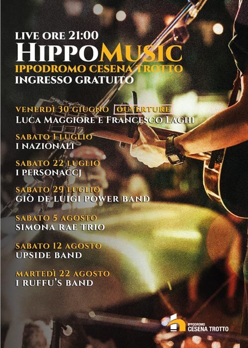 Hippomusic è la rassegna musicale che accompagnerà alcune tra le più importanti serate di corse della stagione. Gruppi musicali e cover band si esibiranno negli intervalli tra le corse venerdì 30 giugno, tutti i sabati di luglio, il 5 il 12, il 22 agosto e sabato 2 settembre.