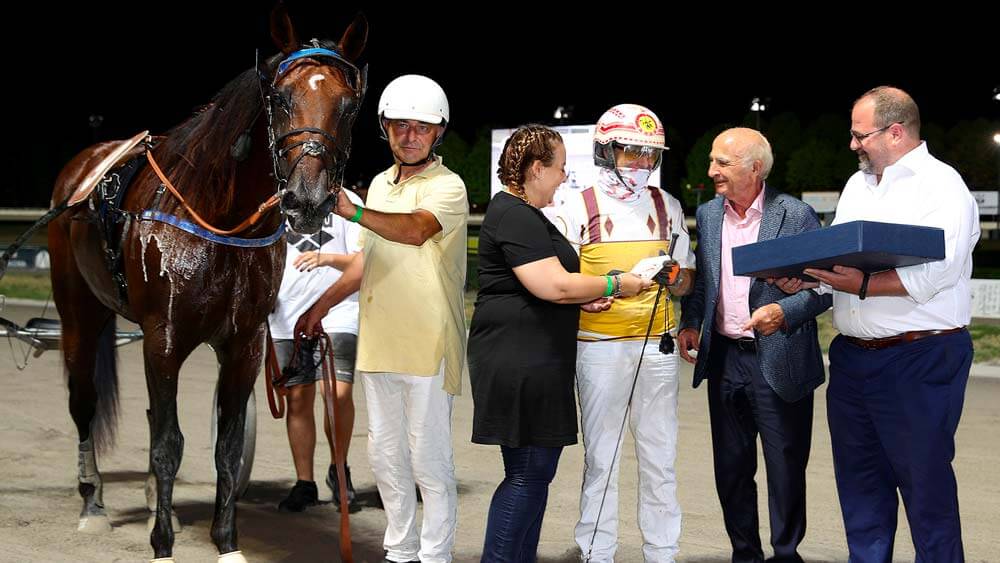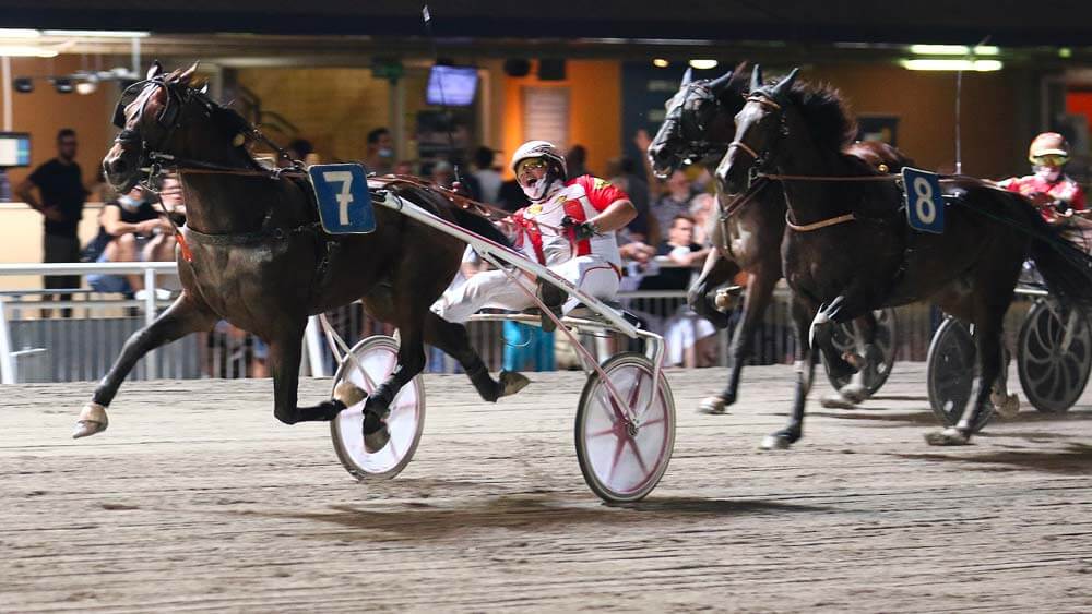 La spallata decisiva alle ambizioni di Vp arrivava alla quinta corsa, con l’inseprata vittoria di Zeus Boy, uno degli outsider del competitivo contesto che grazie ad un arrivo al fulmicotone sorprendeva gli avversari affermandosi in 1.15.4 sulle coppie Zebù Risaia Trgf/Pistone e Stricker/Pettinari. Giallo alla sesta corsa, con Vp quasi certo della promozione ma colpito dal ritiro di Specialess, forfait che gli regalava tre punti per default sancendone il pass al 17 agosto, mentre in pista un eccezionale Umberto Axe si imponeva in 1.12.8 nelle mani di Francesco Pettinari, diventato così il miglior secondo nelle semifinali sin qui disputate e per regolamento qualificatosi per il gran finale del 17 agosto. Per la cronaca, seconda posizione per Aramis Ek e Max Castaldo sugli outsider Astecca Dimar e Di Nardo. All’epilogo, sfida slegata dal Trofeo, Angelica e Marco Stefani preminenti in zona cesarini sui favoriti Azalea jet e Pisacane, terzi Zagara N’Bigi e Ferrante autori di un vibrante finish conclusivo.