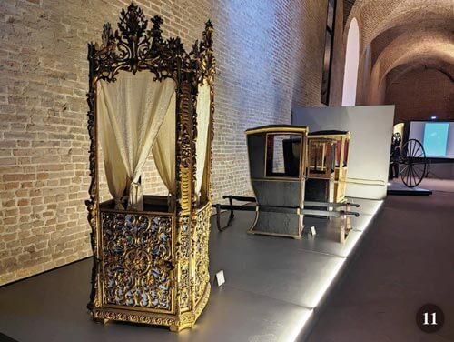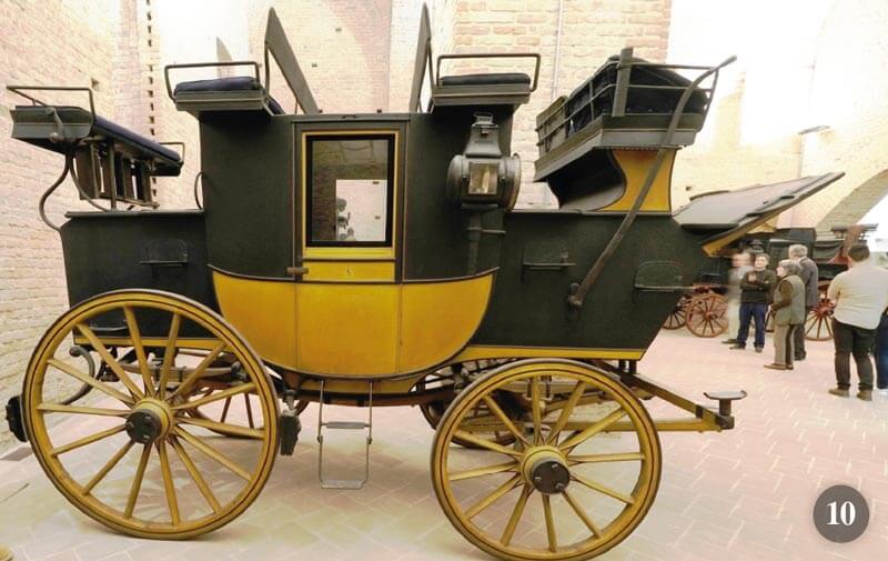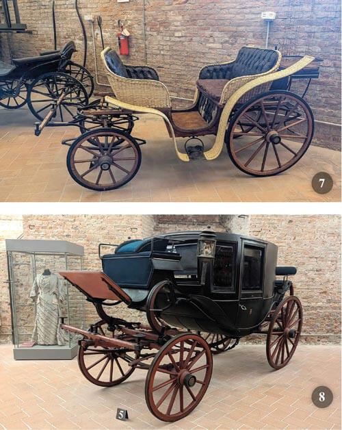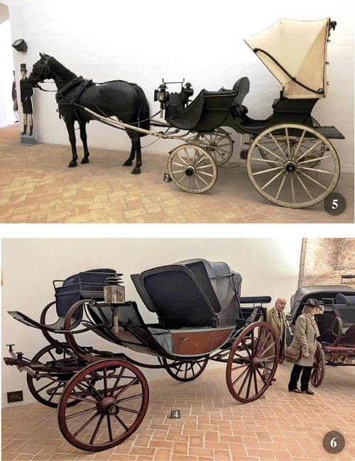 Tre Sociable tra i quali il primo, datato tardo Settecento, si fa notare per qualità ed eleganza nonché per un marchio che rimane purtroppo ignoto, uno stemma con corona a nove punte e le lettere “C. D.”. Si prosegue poi con modelli originali quali un Break de Chasse con spazio per il trasporto dei cani o un Wourche, carrozza dalla costruzione complessa e smontabile nelle sue parti di copertura superiori durante la bella stagione.
