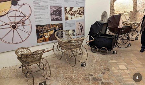 Sull’altro lato invece le carrozze giocattolo, tra cui svetta una piccola, ma perfetta, Calèche barouche. Completano la selezione un cavallino a dondolo di inizio Novecento e, di nuovo a firma “Cesare Sala”, un passeggino costruito per l’infanzia di Vittorio Emanuele III.