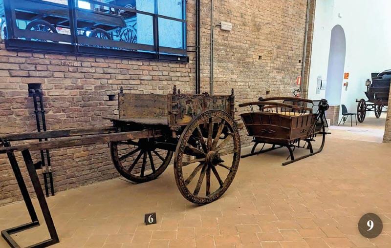 La prima carrozza che si incontra prima dell’ingresso vero e proprio è anche quella che chiude il percorso “ad anello” della visita; un Sulky di fabbricazione modenese con marchio recitante “Simonazzi Remigio” dal design elegante e snello. Ad accompagnare questo carrozzino, un cavallo di legno a grandezza naturale, opera di un soldato del Regio Esercito, retaggio del passato di Piacenza come importante distretto militare.
