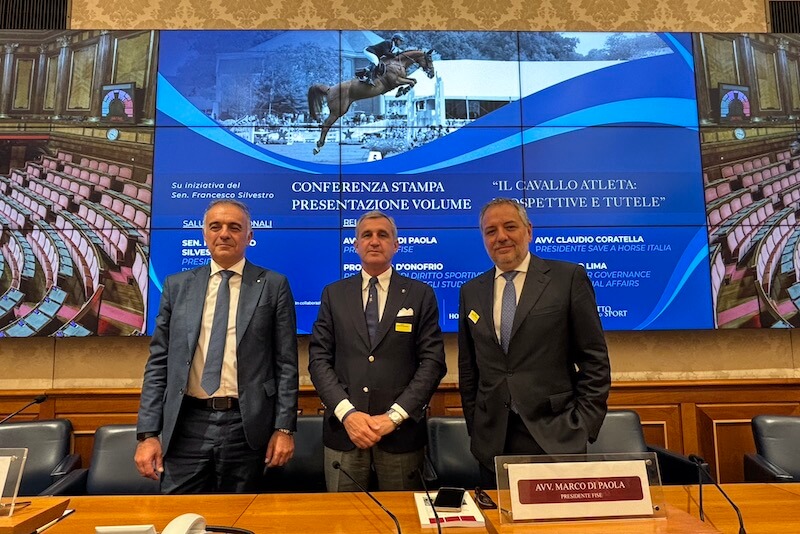 Alla presentazione, dopo i saluti istituzionali del Sen. Francesco Silvestro, Presidente bicamerale Questioni Regionali, sono intervenuti Marco Di Paola, Presidente della Federazione Italiana Sport Equestri; Francisco Lima, FEI Director Governance & Institutional Affairs; Paco D’Onofrio, Professore di Diritto Sportivo dell’Università degli Studi di Bologna, Claudio Coratella, Presidente di Save a Horse Italia e numerosi esperti del settore.