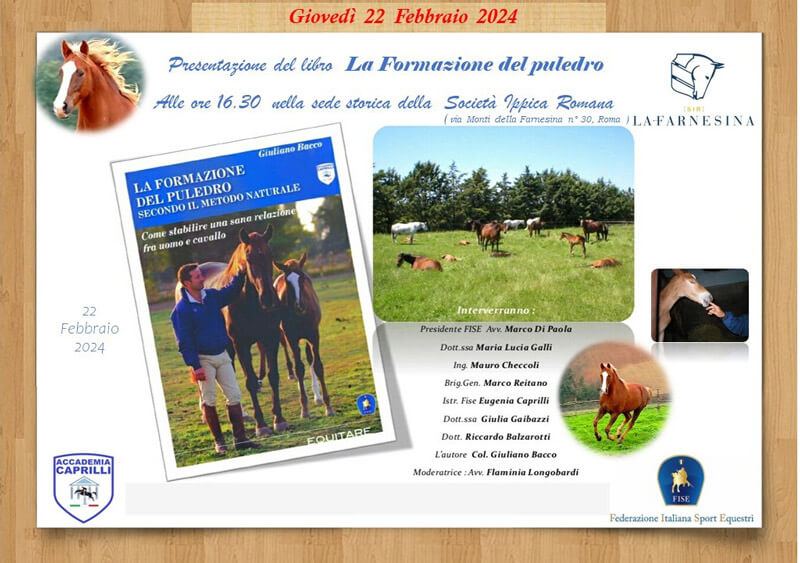 In occasione dell’uscita della nuova edizione ampliata de La formazione del puledro secondo il Metodo Naturale – Come stabilire una sana relazione fra uomo e cavallo di Giuliano Bacco, le Edizioni Equitare vi invitano alla presentazione che si terrà giovedì 22 febbraio alle 16,30 nella sede storica della Società Ippica Romana La Farnesina, via dei Monti della Farnesina n. 30, con il patrocinio della FISE e dell’Accademia Nazionale Federigo Caprilli.