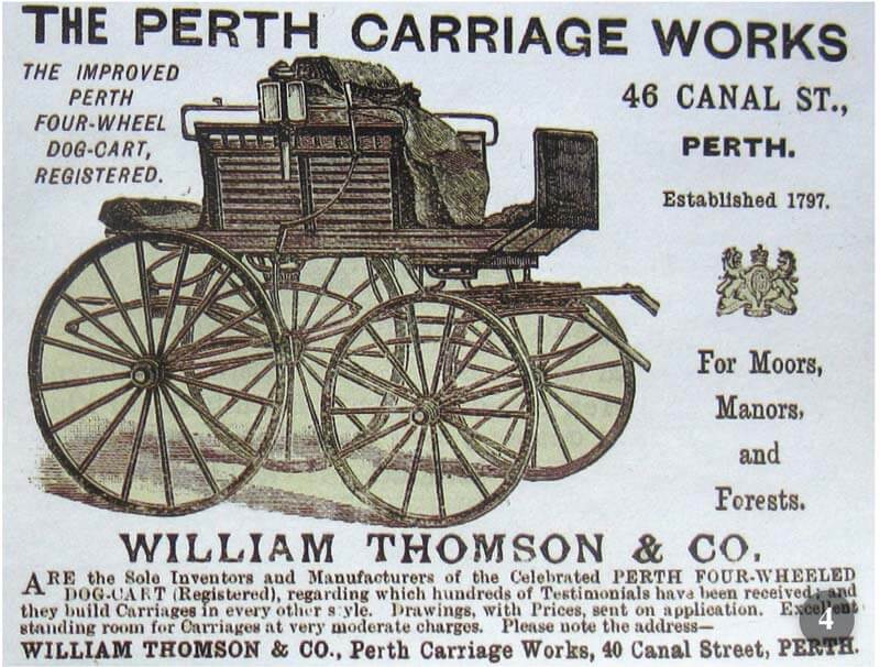 La pubblicazione The Sporting Gazette del 2 gennaio 1864 riportava « l’ormai famoso Perth Dog-cart è stato inventato e prodotto per nove anni da William Thomson, carrozziere di Perth. Durante questo periodo, ha costruito su ordinazione più di 800 esemplari per sportivi, soldati e diversi gentiluomini in questo paese, nel continente, in India e nei due continenti d’America ».