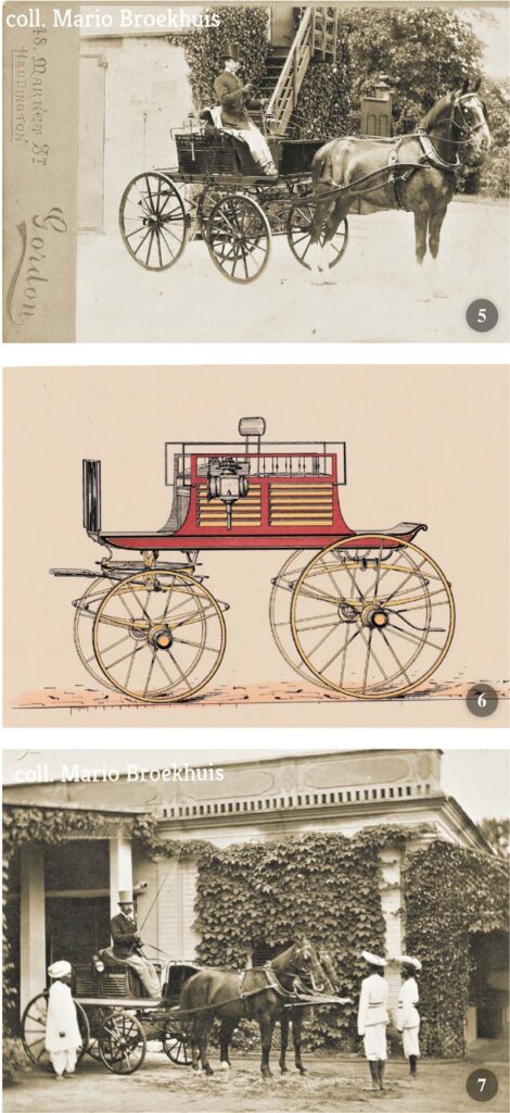 I due disegni mostrano la stessa vettura: stesso fondo piatto senza passaruota, che si estende posteriormente simmetricamente all’anteriore, stessa carrozzeria rettangolare, stessa disposizione dei pannelli per areazione in due file verticali, stessi fregi di colonnine a coronamento delle fiancate. L’esempio di questo Dog-cart apparso nel 1862 e presentato nel 1907, quarantacinque anni dopo, come novità, dimostra che la moda, in fatto di carrozzeria come in tutti i settori, è un eterno revival.
