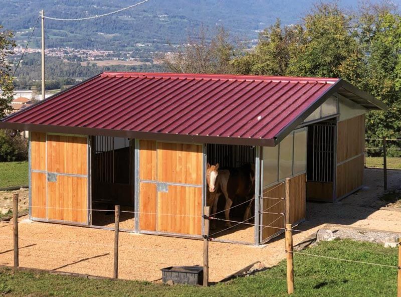 Il box deve avere dimensioni minime di m 3×3 in modo da rendere confortevole la permanenza del cavallo al suo interno. Deve avere una copertura isolata, va bene il pannello sandwich, meglio se di grosso spessore. Per un aspetto estetico migliore, si può optare per una copertura in legno con rivestimento esterno in pannello coibentato.