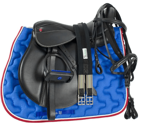 Set composto da sella da salto HDR Advantage in cuoio completa di briglia con redini in gomma, sottopancia in neoprene, sottosella rettangolare con cuffia coordinata, staffe in acciaio inox e staffili in nylon foderati