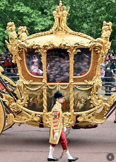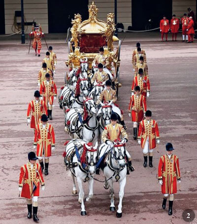 La Gold State Coach è la più antica e l’unica carrozza del 18° secolo ancora in uso… in rarissime occasioni! Negli ultimi 70 anni ha lasciato le Scuderie Reali solo tre volte: il 2 giugno 1953 per l’incoronazione di Elisabetta II, il 7 giugno 1977 per il suo giubileo d’argento (25 anni di regno) e il 4 giugno 2002 per il suo giubileo d’oro (50 anni di regno). Preceduta e seguita da diverse decine di soldati in sgargianti uniformi montati su superbi cavalli, la maggior parte neri, apparve il 5 giugno in tutto il suo splendore con la sua squadra di otto cavalli grigi, i famosi Windsor Greys, selezionati per il loro mantello grigio. Il loro nome deriva dal fatto che erano alloggiati nelle scuderie del castello di Windsor dove trainavano le auto private della famiglia reale. Furono trasferiti a Londra durante il regno di Giorgio V. Non appartenenti a una razza particolare, sono scelti per la loro statura, almeno 1,65 m al garrese, il loro carattere calmo e freddo e il loro mantello grigio.