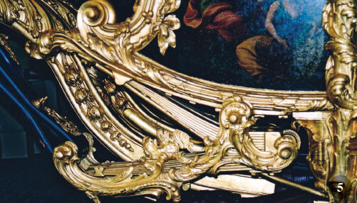 Interamente in legno dorato, e non “in oro” come dichiarò stupidamente un giornalista di un canale di informazione, la Carrozza d’Oro è, con le tre carrozze conservate al Museo delle Carrozze di Lisbona del Marchese de Fontes, ambasciatore a Roma del Re del Portogallo Giovanni V nel 1716, la carrozza che presenta la più importante decorazione scultorea con figure a tutto tondo a grandezza naturale incarnate da quattro tritoni monumentali eretti agli angoli del veicolo. Mitiche creature marine con un busto umano e una coda di pesce, simboleggiano il potere e il dominio marittimo britannico. I soppalchi in pelle che sostengono il corpo della carrozza sono attaccati alle spalle di questi mostri marini. I primi due, sull’avantreno, irrigiditi come se stessero trainando la carrozza grazie ai soppalchi, soffiano in conchiglie per annunciare l’arrivo del sovrano. Al centro cherubini imperiali, che rappresentano l’unione di Inghilterra, Scozia e Irlanda, sorreggono la Corona Imperiale. Questi grandi pezzi di scultura si inseriscono in un lussuoso decoro superbamente eseguito in basso e altorilievo: museruole di leoni e ghirlande di fogliame alla linea di cintura del corpo, palme che danno forma ai piedi d’angolo e di ingresso alle porte, trofei d’armi e piume creste agli angoli dell’imperiale. La ricchezza della decorazione scolpita da Wilton costituisce una sorta di cornice per i pannelli dipinti da Giovanni Battista Cipriani che rappresentano allegorie alla gloria dell’Impero Britannico.