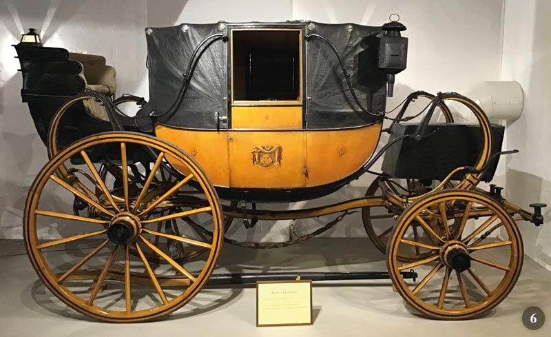 - Reislandauer o Dormeuse costruita da Williams & C a Londra gli inizi del 1800. C’è una lunga storia associata a questa carrozza unica. Fu realizzata per l’Alto Sceriffo del Lancashir e con questa lui viaggiò in Francia, in Italia ed in Egitto. Lo stemma, invece, è distintivo della famiglia Hestketh di Preston, che acquistò la carrozza nel 1819 e la portò a Nizza. Ben quattordici muli dovettero trainare questa carrozza Dormeuse attraverso il passo del Moncenisio.