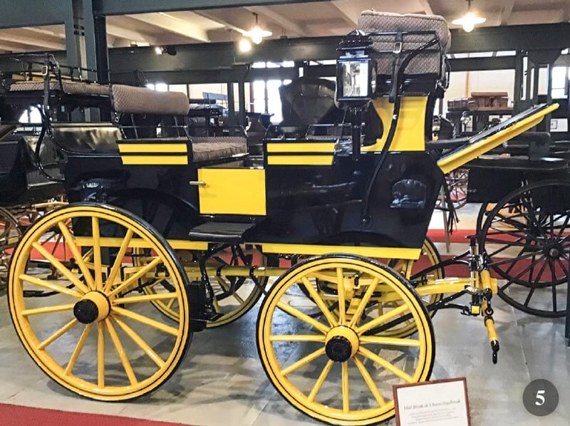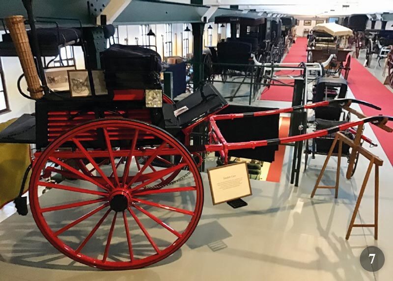 - Uno scorcio di una delle sale espositive di Hainz Scheidel. In primo piano una carrozza di origine irlandese chiamata “Suicide gig”. Da notare lo speciale doppio sedile alto per i groom su questo Tandemcart. Il peso è quindi molto elevato, da cui il nome “suicide gig”. Questo tipo unico di carrozza era già noto nel 1813.