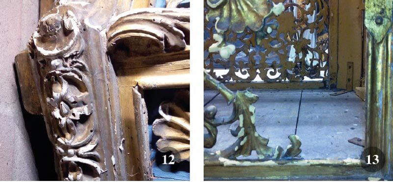 Molte parti lignee di intaglio erano andate perdute, parecchie zone di gessatura di base erano sollevate e, in alcuni casi. completamente perdute insieme alla doratura di superficie. Era anche in atto un forte attacco da parte di insetti xilofagi e le tendine insieme alla tappezzeria interna in seta, ancora in parte presenti, si trovavano in pessime condizioni. Si rese così necessario un intervento approfondito di recupero mantenendo il concetto di restauro conservativo e reversibile come linea di base.