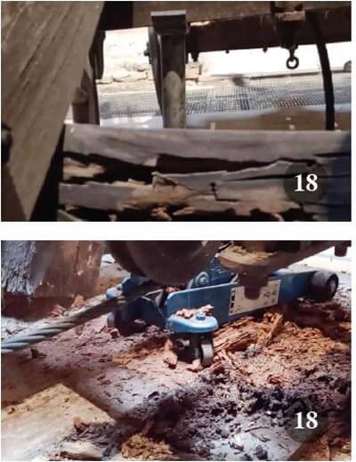 Purtroppo a causa di infiltrazioni, continue negli ultimi anni, di acqua piovana dalla copertura del cavedio (bisogna ricordare che in origine tale ambiente di Palazzo Farnese era stato studiato appositamente per raccogliere le acque piovane) molte parti strutturali posteriori del carro si erano completamente ammalorate, con il rischio di collassare improvvisamente a causa dei gravi danni ai sostegni lignei dei contrappesi posteriori. In questa situazione mi venne dato l’incarico urgente di procedere all’immediata esecuzione delle operazioni di messa in sicurezza prima e di ricostruzione delle parti degradate in seguito.