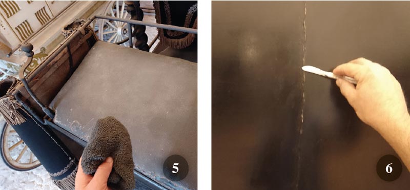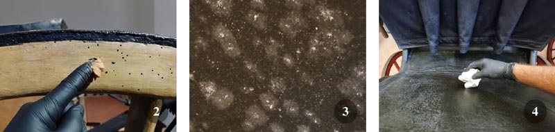 Arrivando alle vere e proprie fasi operative bisogna, innanzitutto, ricordare che è consigliabile ridurre il più possibile l’impiego di sostanze liquide a base acquosa e/o a grassi animali, facilmente deperibili in ambienti umidi. Sulle superfici organiche porose (legno, cuoio, stoffe ecc.) l’applicazione di balsami e creme trova spesso largo impiego come protettivi e nutrimenti per cuoio e pelli ma, se depositati in modo inappropriato ed eccessivo da personale inesperto, potrebbero rappresentare fonte di nutrimento per funghi e muffe (soprattutto se il luogo di giacenza dell’oggetto è un ambiente umido) e innescare fenomeni di degrado biologico o ugualmente attrarre insetti striscianti, che causerebbero progressivamente un ulteriore degrado.