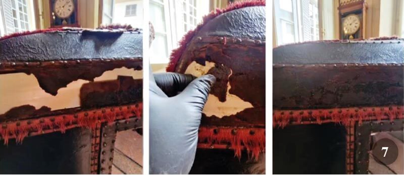 Infine, semestralmente avviene il trattamento delle pelli e dei cuoi con la stesura controllata di emulsione composta appositamente, con cere sia naturali (carnauba e d’Api), che sintetiche. Un’altra operazione che potrebbe divenire necessaria, a causa delle più frequenti variazioni improvvise del microclima ambientale interno, innescate dal cambiamento climatico (piogge improvvise, intense e continuative) è l’asportazione a secco e per aspirazione con successiva inibizione delle colonie di muffe che, in poco tempo, si diffonderebbero su tutte le strutture. Per quanto riguarda la lotta agli insetti e in particolare a quelli xilofagi e ai Lepisma saccharina (pesciolini d’argento) utilizzo un sistema di disinfestazione a nebulizzazione con una soluzione di Permetrina e cinnamomum canphora, che permette di raggiungere anche parti più recondite all’interno e all’esterno delle stoffe.