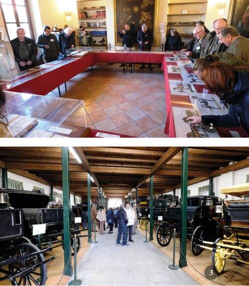 C’è stato anche ltempo per Dino Crippa di mostrare ai presenti la sua straordinaria collezione di libri, compresi molti libri illustrati splendidamente riguardanti carrozze e finimenti, letteralmente migliaia di cartoline e alcuni eccezionali documenti storici della Santa Sede risalenti a secoli fa. Dino è giustamente molto orgoglioso della sua biblioteca ed ha così tanti libri e documenti che la scuola locale lo assiste con la necessaria catalogazione per mantenere tutto in ordine e accessibile. Dopo un delizioso pranzo leggero abbiamo salutato La Lodovica e ci siamo recati nella città di Piacenza, a circa 90 chilometri di distanza, per visitare la Collezione di Carrozze di Palazzo Farnese.